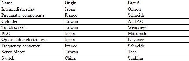2) მოწინავე მსოფლიოში ცნობილი ბრენდის კომპონენტების მიღებას პნევმატური ნაწილების, ელექტრო ნაწილების და ოპერაციის ნაწილებში.