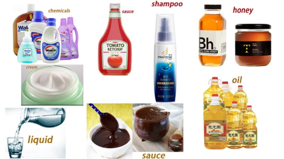 ნახევრად ბლანტი და ბლანტი სითხეები; კატუპი, მდოგვი, სიროფი, სალზა, მაიონეზი, თაფლი, არაქისის კარაქი, ჟელე, ჩამოსასხმელი სოუსი, ტუჩის ბალზამი, შამპუნი, სქელი საპნები, სტილის გელები, სახის ნიღბები, ცვილი, წებო, ცხიმი, სეგმენტები, სილიკონი და მრავალი სხვა